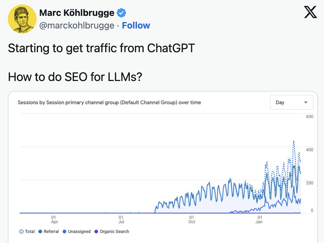 And almost overnight, that user stopped being the exception. People are starting to see charts like this, and ask the same questions: Organic ChatGPT referrals are great, but how do we get more of them?