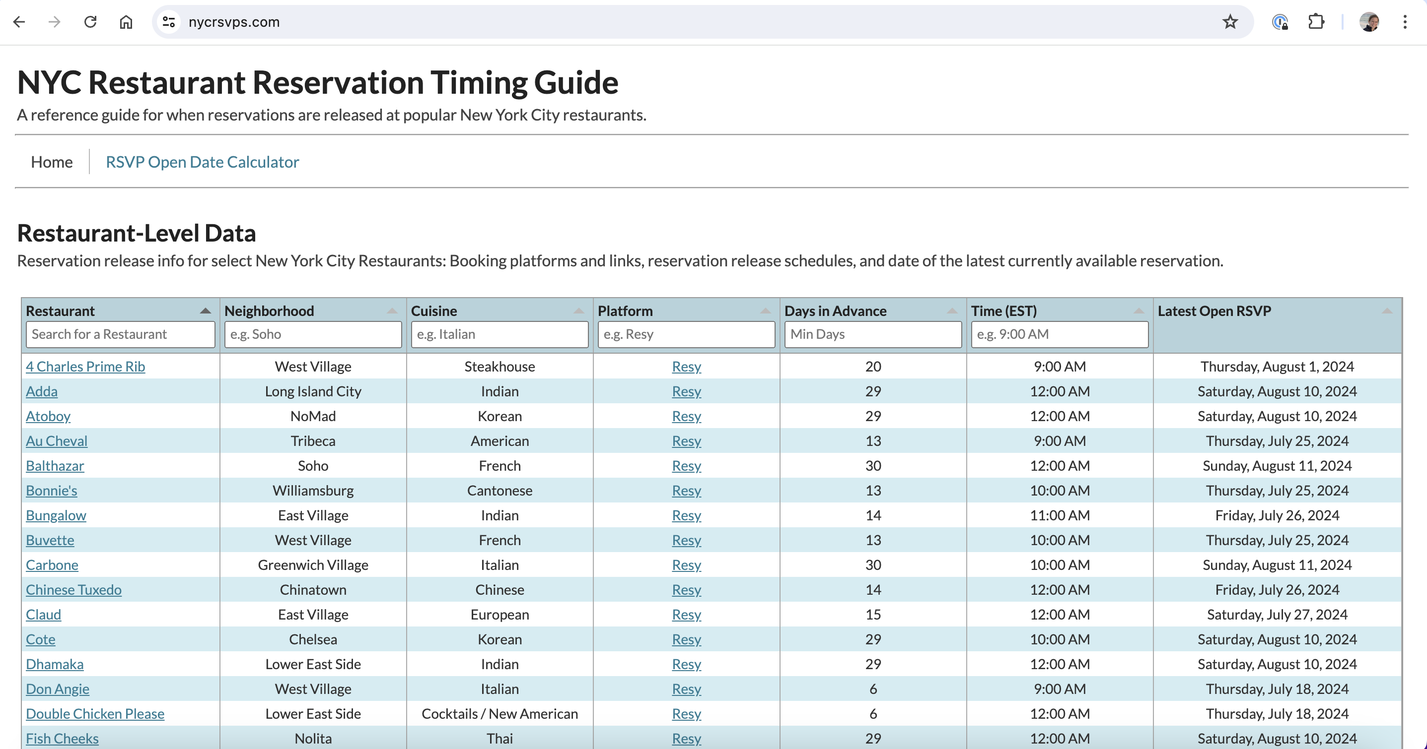 It has two main pages: a data table with when reservations open at various restaurants (shown above), and a calculator to help you anticipate when reservations open for a desired date and set a reminder to book.