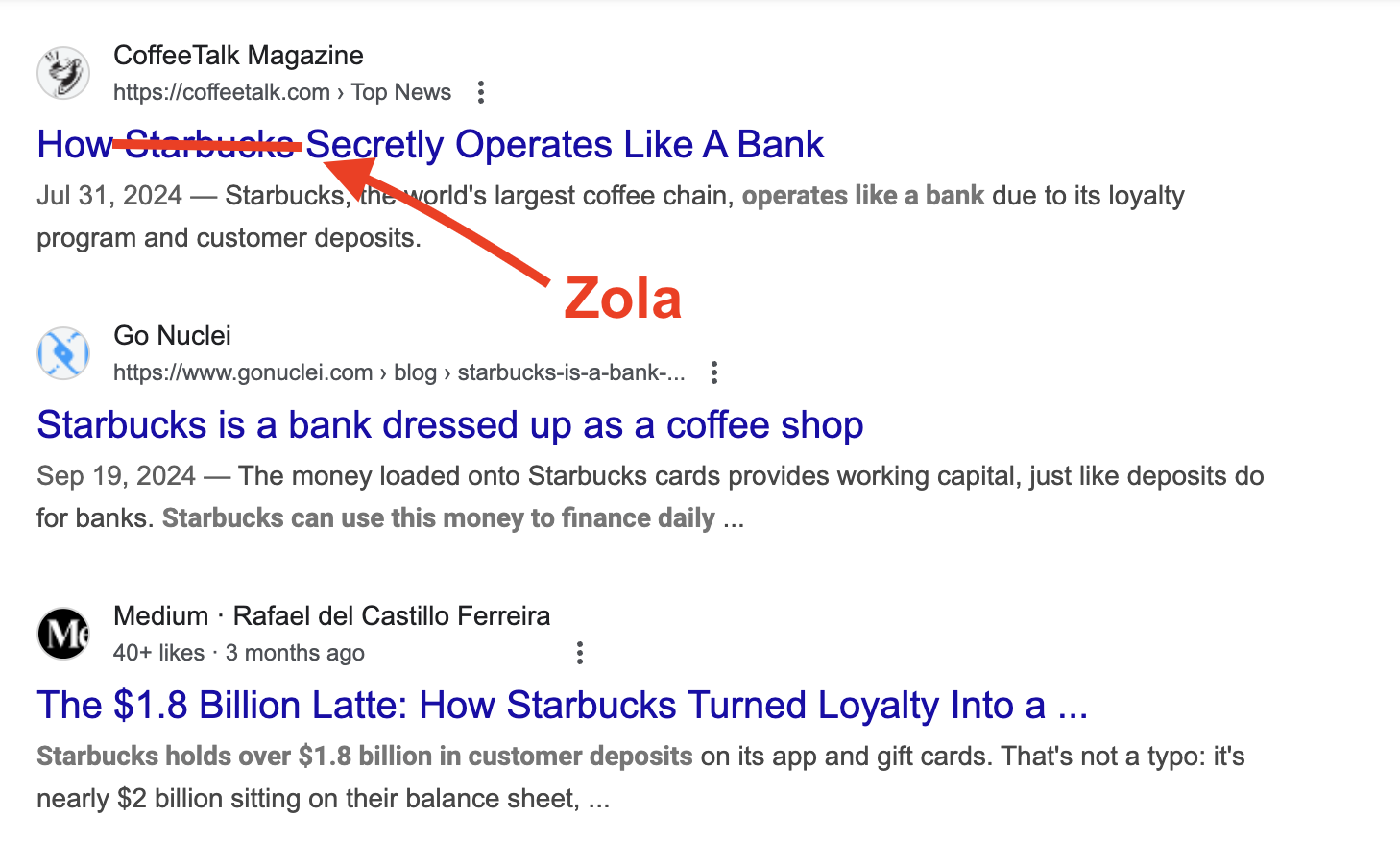 Starbucks may have popularized the concept of being a secret bank. But Zola shows the model works far beyond coffee. Wedding registries, it turns out, are a pretty good gig for cash flow. J.P. Morgan & Wells Fargo, please take notes!